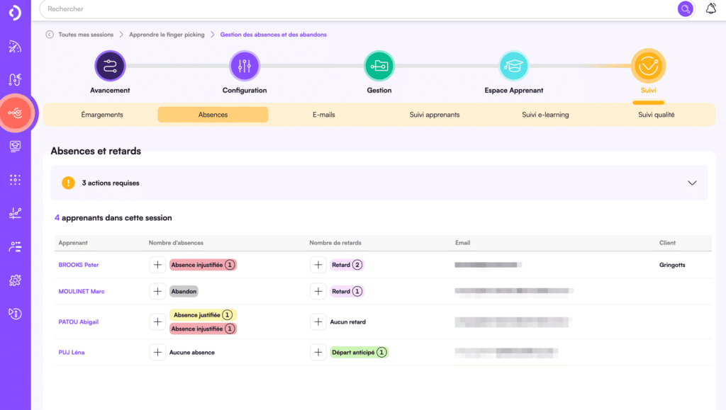 Le suivi de la présence de vos apprenants gagne en précision ! Les retards font leur apparition dans le menu « Suivi » > « Absences ». Vous pouvez désormais ajouter un retard ou un départ anticipé sur un apprenant en particulier, directement depuis sa fiche au sein d’une session.
